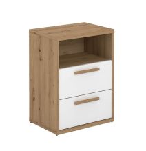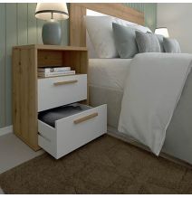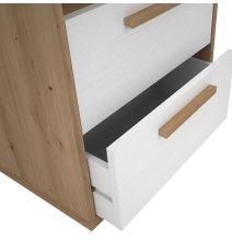 Esta mesilla de noche es la mezcla perfecta de practicidad y diseño. Con su acabado en roble albar y blanco poro, y tiradores de madera que aportan calidez, es ideal para crear un ambiente acogedor y con personalidad. Su diseño de líneas limpias encaja perfectamente en decoraciones contemporáneas, nórdicas o juveniles.